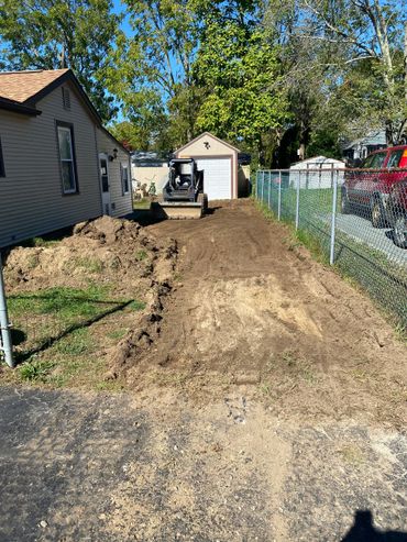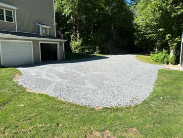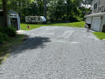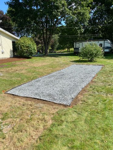 4-6” Excavation of Top Layer, Application of Geo Textile Fabric which helps prevent weed growth and keeps gravel from sinking into soil base over time from vehicle weight, which causes ruts and wash-out areas.