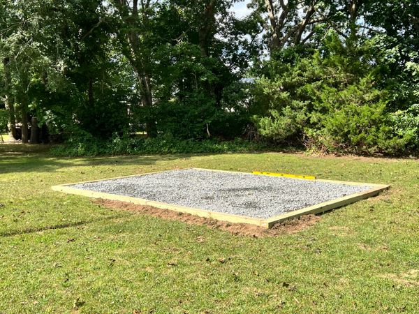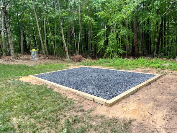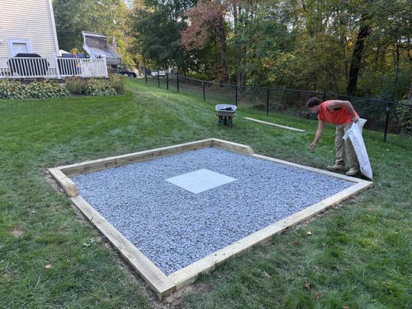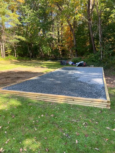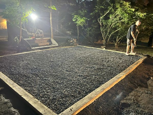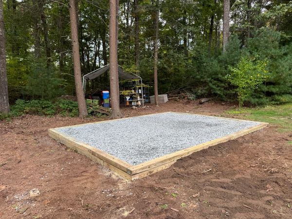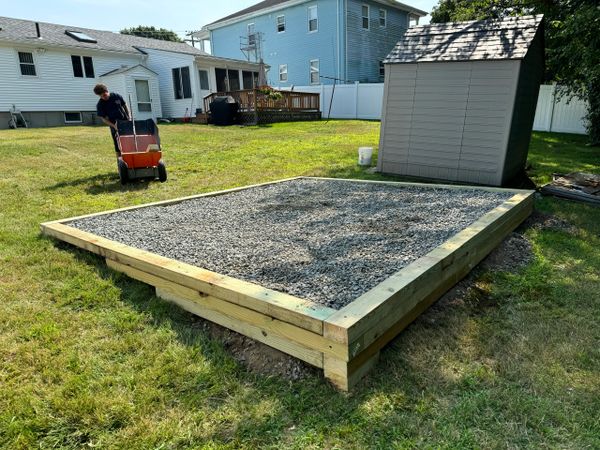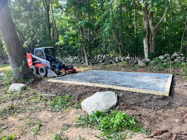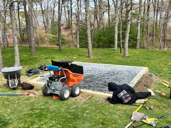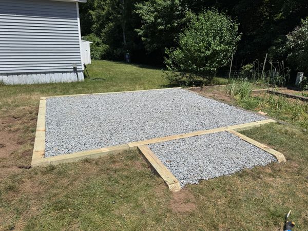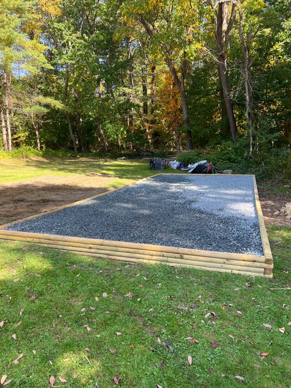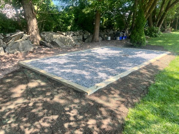 On shed pads we will also lay down commercial quality landscape fabric under the top coat(s) of material to prevent the material from sinking into the substrate (dirt) below. This is also an often overlooked steps which can lead to rapid deterioration of the finished product as the top-coat material sinks into the dirt substrate below.