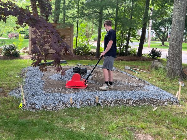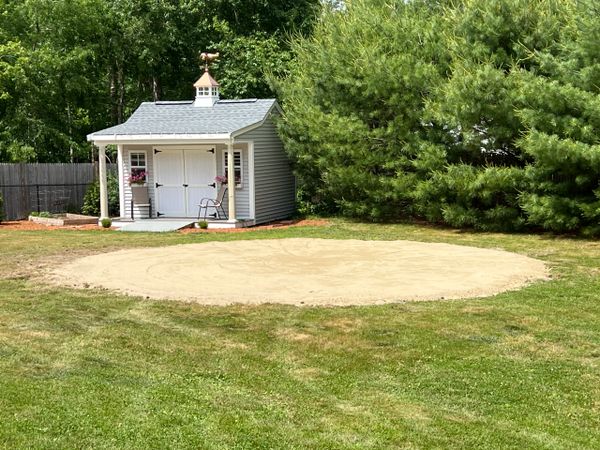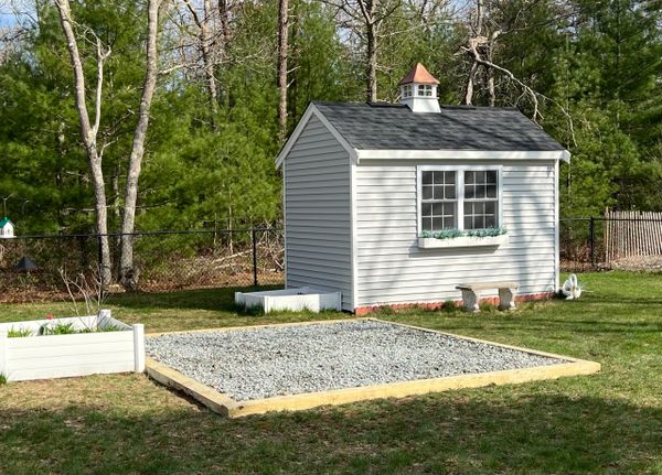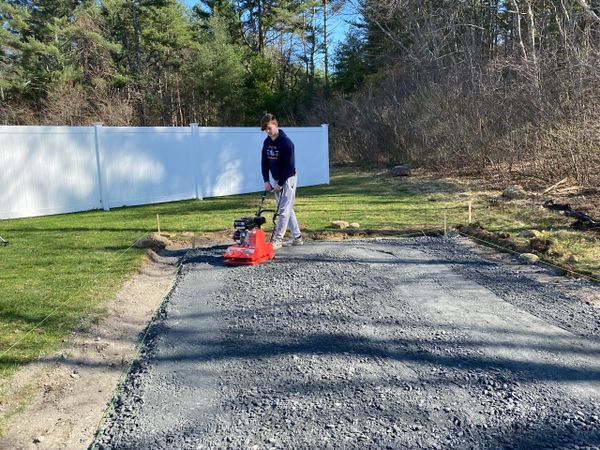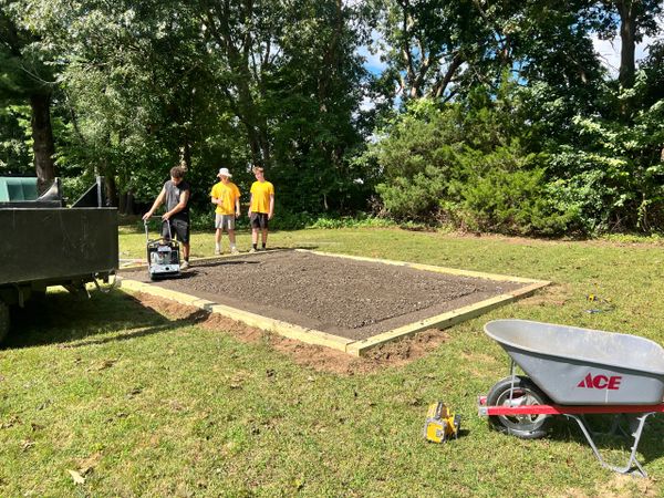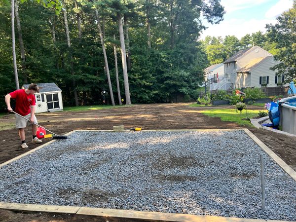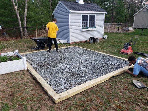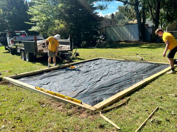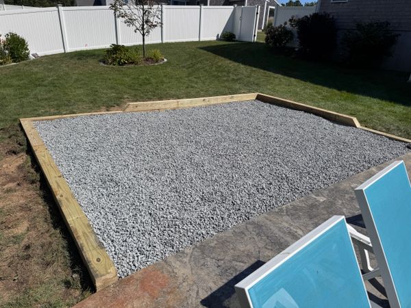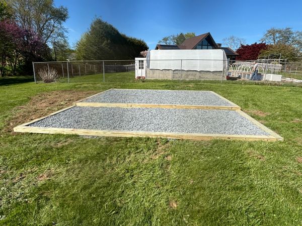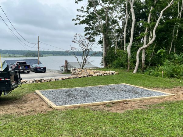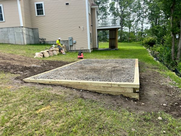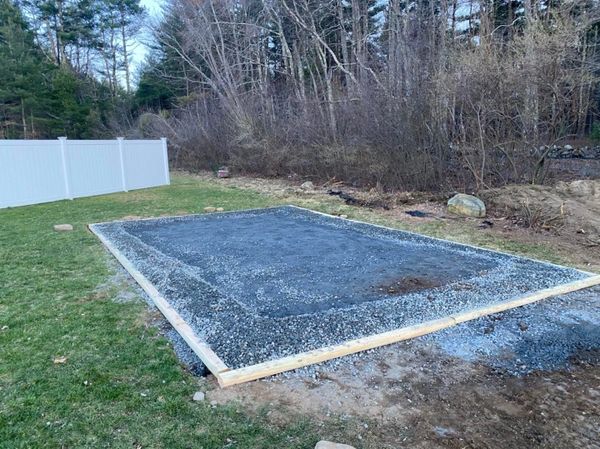 On shed pads we will also lay down commercial quality landscape fabric under the top coat(s) of material to prevent the material from sinking into the substrate (dirt) below. This is also an often overlooked steps which can lead to rapid deterioration of the finished product as the top-coat material sinks into the dirt substrate below.