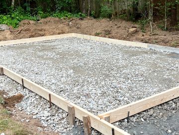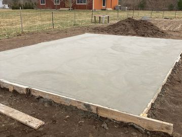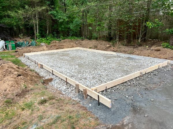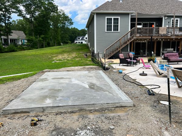 We excavate down approximately 6-8", and install a laser leveled compacted crushed concrete base. A fiber reinforced 6" concrete slab is then formed, poured, and finished. We offer optional channel drains as well for structures with a canopy, or adjacent to sloped areas with run-off. (Such as a pool deck)
