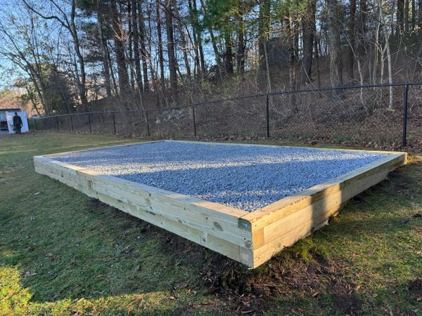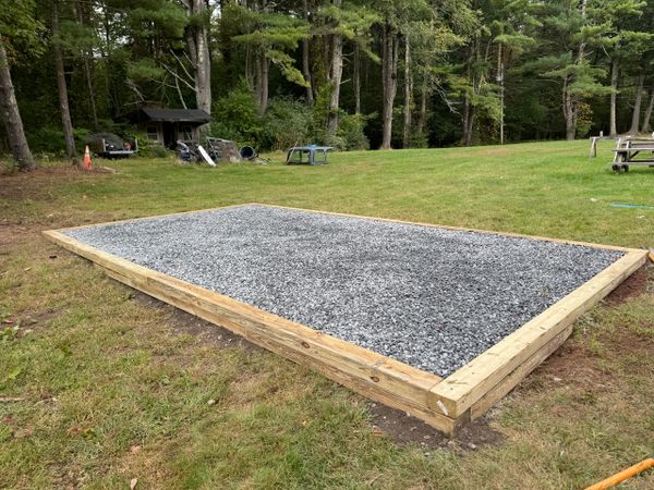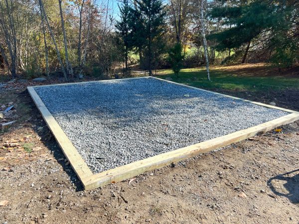 This is is our most common shed pad style. We excavate all compost and loam base down a few inches, then install a laser-leveled compacted crushed concrete base over commercial landscape fabric topped with your choice of 3/4 Bluestone or Natural (tan). A pressure treated 4"x6" timber border is installed with galvanized brackets, staked rebar, and Timberlok structural fasteners.